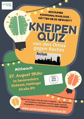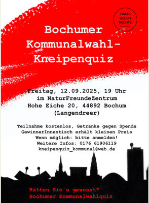 Im Vorfeld der Kommunalwahl haben wir in verschiedenen Stadteilen und Veranstaltungsorten unsere Kneipenquizze angeboten (Freiraum Dahlhausen, KoFabrik, Café Konkret, AWO Zentrum im Zentrum, Haus Wiesmann in Wattenscheid) Alle konnten mitraten und haben mit viel Spaß auch überraschende Erkenntnisse gewonnen.